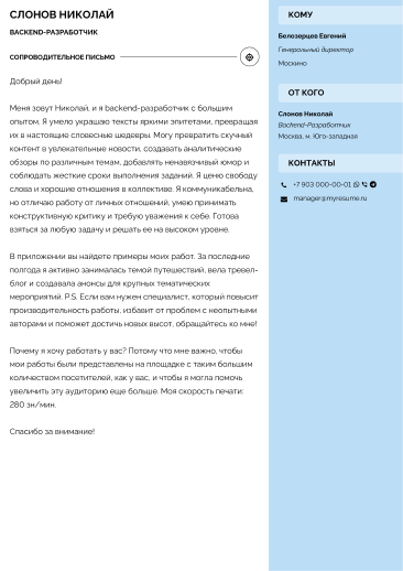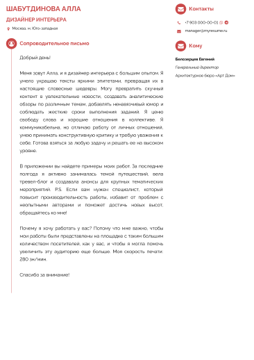 Писать названия блоков на английском языке самостоятельно не потребуется: качественный перевод делается автоматически в один клик. Зайдите в редактор резюме, измените язык с русского на английский и заполняйте документ своими данными. Учитывайте требования к размещению фотографии и не забудьте составить краткое или полное сопроводительное письмо.