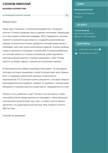 Отправка осуществляется мгновенно! Резюме увидит только человек, которому вы оставили ссылку. Действующий руководитель никогда не узнает, что вы подыскиваете новые варианты трудоустройства.