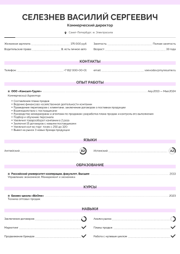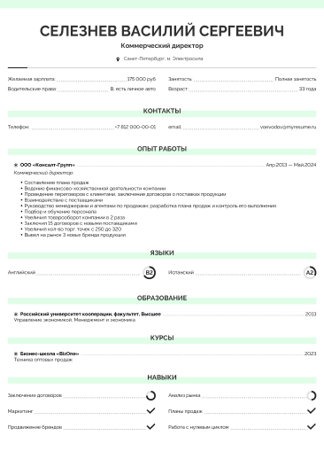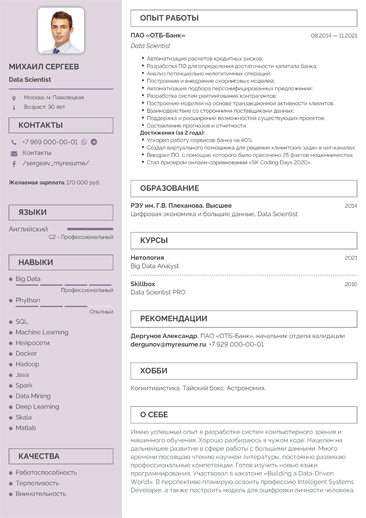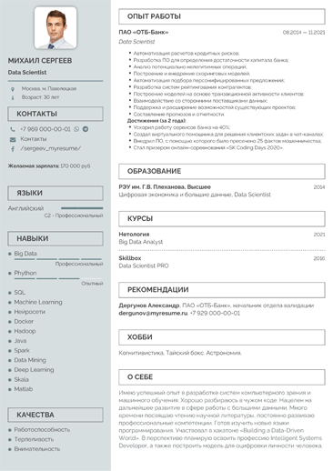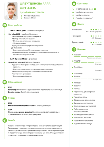 Делите текст на части: заголовки, подзаголовки, маркеры, рамки выгодно выделяют написанное. Наверху лучше располагать личную информацию и контактные данные.
