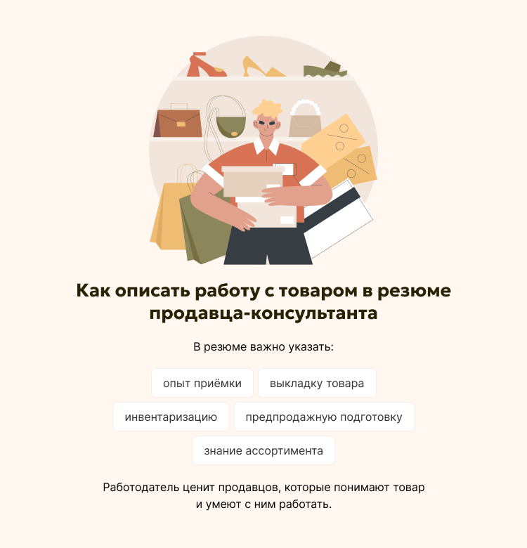 Можно рассказать в этом блоке более подробно о виде товара, с которым вам приходилось работать, а также об уровне обслуживания. Здесь же можно описать личные качества, которые необходимы для работы в торговле. Избегайте шаблонного перечисления через запятую. Лучше опишите, как вы выстраиваете отношения с покупателями, что делаете для повышения привлекательности товара или как выявляете потребность в спросе. В этот же блок вносится информация о наличии сопроводительного письма.