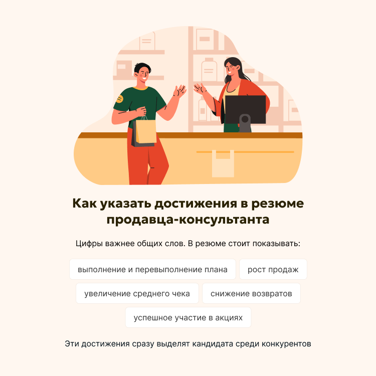 Отличительные качества продавца-консультанта для резюме могут выражаться в успешном проведении рекламной кампании, оптимизации визуального мерчендайзинга, отсутствии возвратов и недостач.